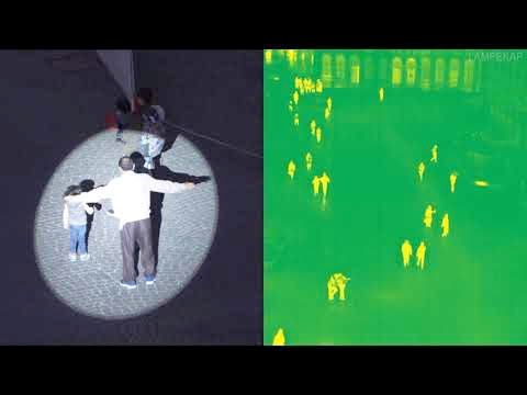 Deux faisceaux lumineux parcourent la place et suivent certains passants pendant quelques instants. Guidés par un système d’intelligence artificielle, ces projecteurs repèrent des silhouettes et choisissent aléatoirement qui sera « mis en lumière ».