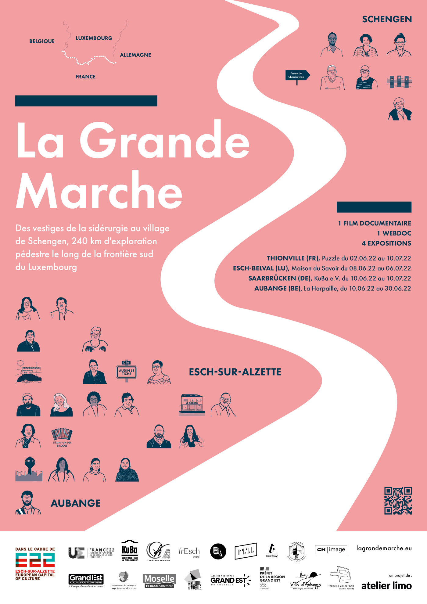 Crise sanitaire, crise financière, crise de l’accueil des réfugiés, crise écologique. Épidémie, mondialisation, Brexit, développement durable, croissance, décroissance… L’Europe est confrontée à une série de défis et de questionnements et peine à répondre aux aspirations des citoyens. Et si, justement, là où tout semble aller trop vite, nous prenions notre temps ? Le temps de la réflexion, celui de l’écoute, de l’échange, celui de la confrontation des avis et des idées ? À l’été 2021, nous partons le long de la frontière sud du Luxembourg, munis de chaussures de marches, d’un sac à dos, de caméras, d’appareils photos et d’enregistreurs. Chemin faisant, nous documentons cette « Europe en miniature » qui regroupe dans un rayon de 30 km, pas moins de quatre pays fondateurs de l’Union européenne. Nous discutons avec ses habitants, présentons leurs initiatives et récoltons leurs avis et leurs visions sur le vivre ensemble, les langues, l’altérité, l’écologie ou la solidarité. « La grande marche » est un projet fédérant à portée citoyenne qui cherche à reconstituer dans une approche à la fois documentaire et participative un chemin alternatif pour une Europe à hauteur d’Homme. Ce projet aboutira à la production d’une exposition itinérante, d’une plate-forme web dynamique et d’un moyen-métrage documentaire présentés sur l’ensemble du territoire transfrontalier de la région, au cours de l’année 2022.