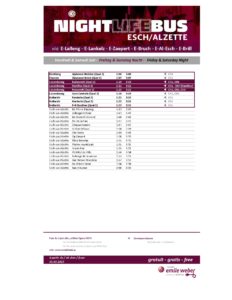 Disponible le vendredi et le samedi, ce service de bus électrique vous transporte sans réservation de Luxembourg-ville à Esch-sur-Alzette de 1h00 à 3h00 du matin. Avec ses 44 places assises, le Nightlife Bus vous assure un trajet confortable et sécurisé. Retrouvez facilement le planning et les arrêts du Nightlife Bus dans la barre latérale de navigation.
